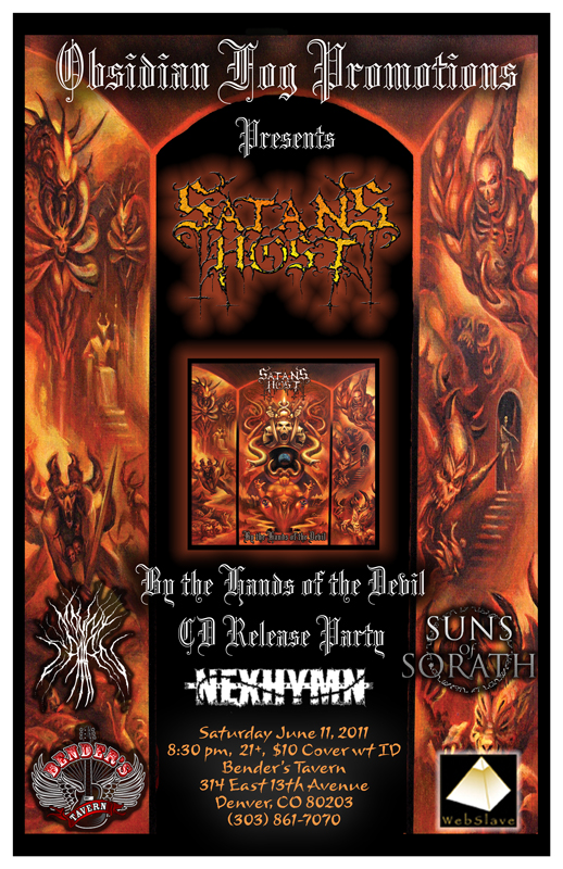 Satan's Host will be appearing Saturday June 11, 2011 at Bender's Tavern for the "By the Hands of the Devil" CD release party. Show presented by Obsidian Fog Promotions with special guests: Nexhymn, Mount Cairn, and Suns of Sorath, 21+, 8:30pm, $10 cover. More details to come soon.