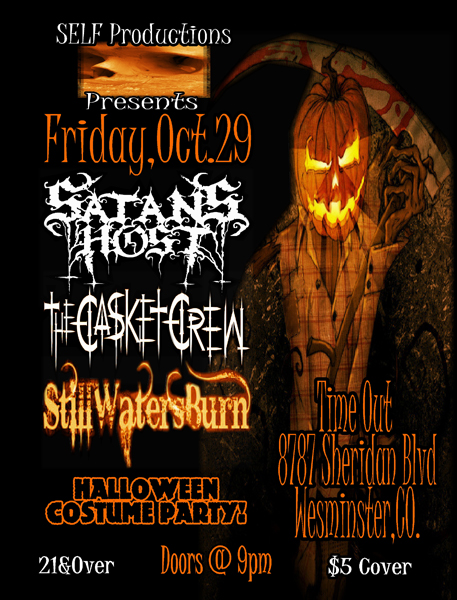 Satan's Host will be appearing on Oct. 29 at Time Out Bar in Westminster CO for a Halloween show presented by SELF Productions, also appearing= The Casket Crew and Still Waters Burn. $5 cover, 21+, 9PM. It will also be a costume party.